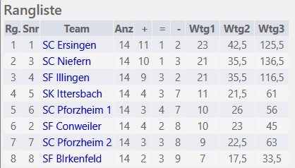 Bei der Mannschaftsblitzmeisterschaft in Conweiler am Sonntag, 8. Februar, waren erfreulicherweise acht Teams am Start, auch wir waren mit einer Mannschaft vertreten. Am Ende reichte es zum Vizemeistertitel, es wäre aber auch der Meistertitel drin gewesen, immerhin hat man gegen dem Meister Ersingen 2x gewonnen. Für uns spielten in der der Brettreihenfolge: Christian (5,5 aus 14), Edwin (10), Jürgen (9) und Alexander (11,5).